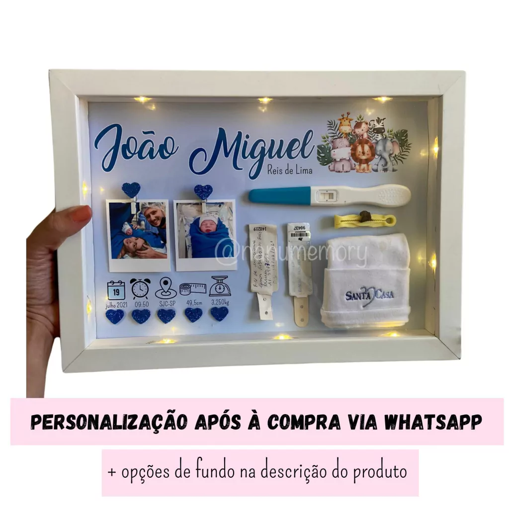 - Fundo personalizado com nome da criança, juntamente com as informações do nascimento: Nome, Data, hora, peso, altura e cidade natal (preferencialmente abreviada);