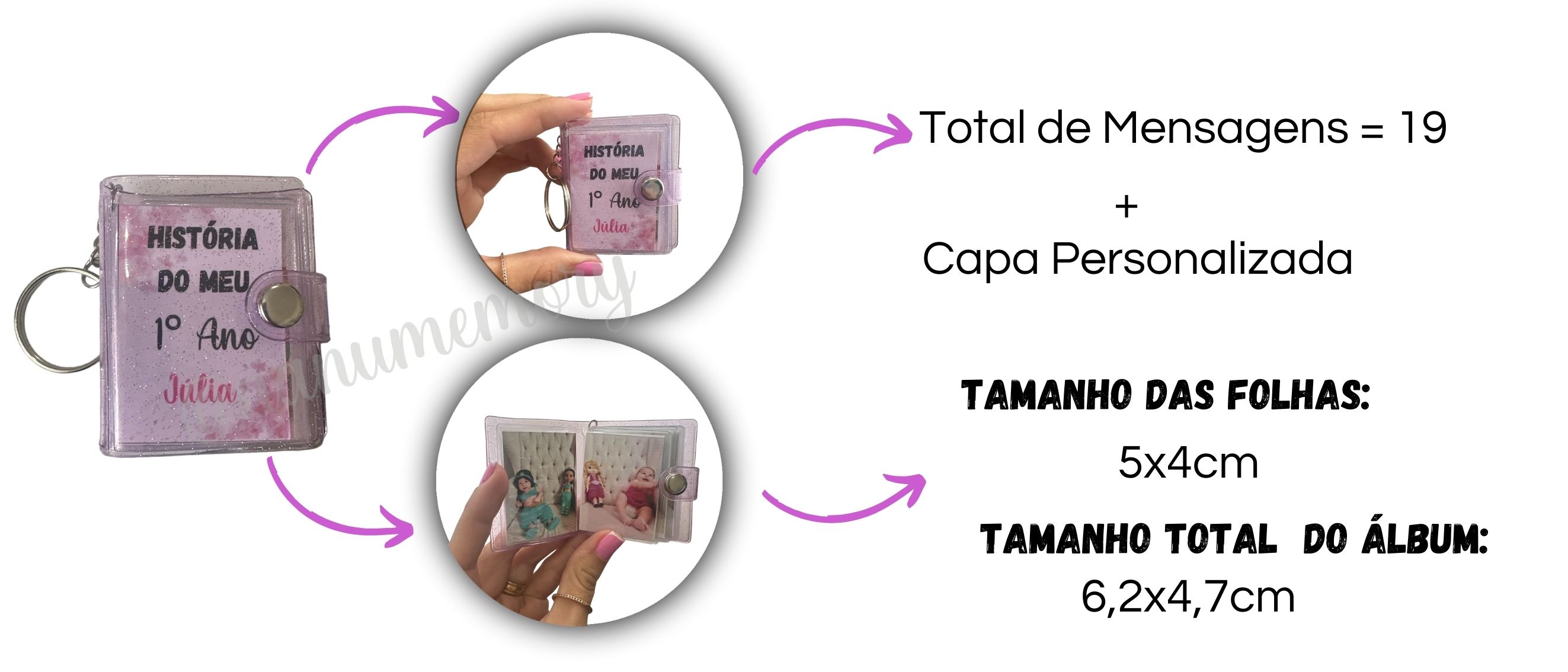 - Quantas páginas tem o mini álbum? 10 páginas, frente e verso (espaço para 20 fotos).