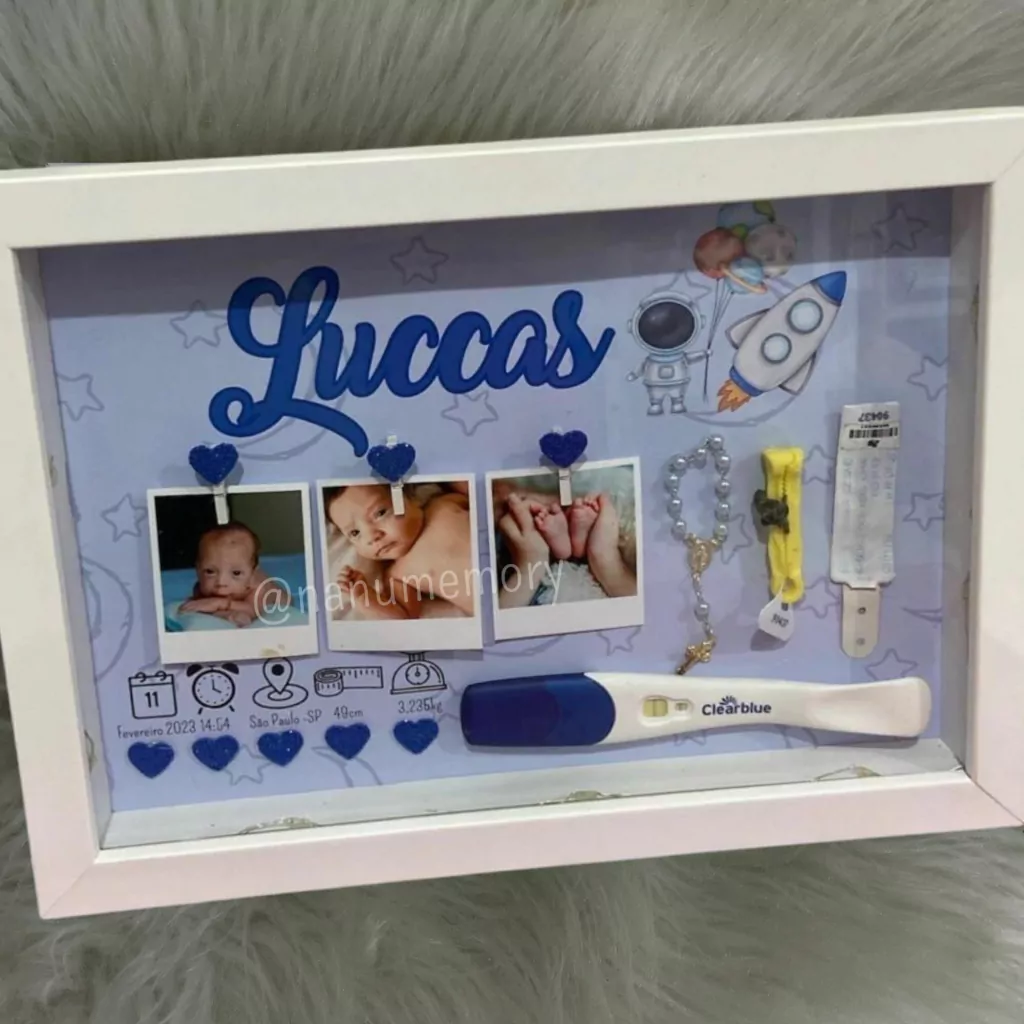 - Fundo personalizado com nome da criança, juntamente com as informações do nascimento: Nome, Data, hora, peso, altura e cidade natal (preferencialmente abreviada);