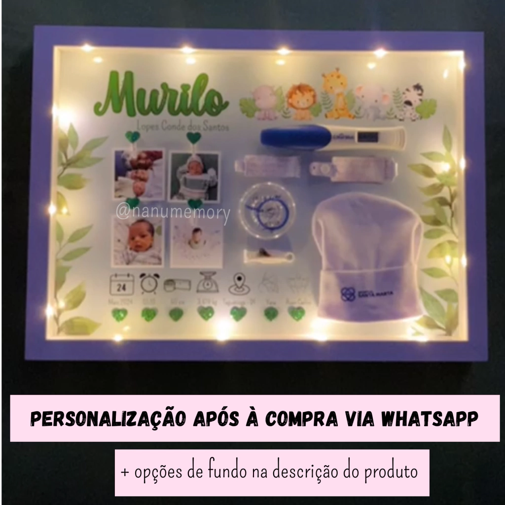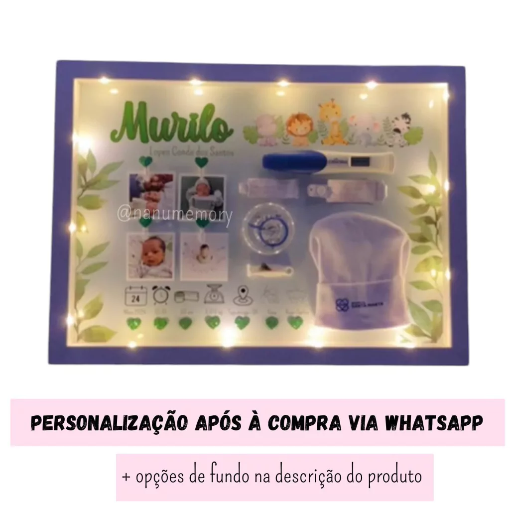 - Fundo personalizado com nome da criança, juntamente com as informações do nascimento: Nome, Data, hora, peso, altura e cidade natal (preferencialmente abreviada);
